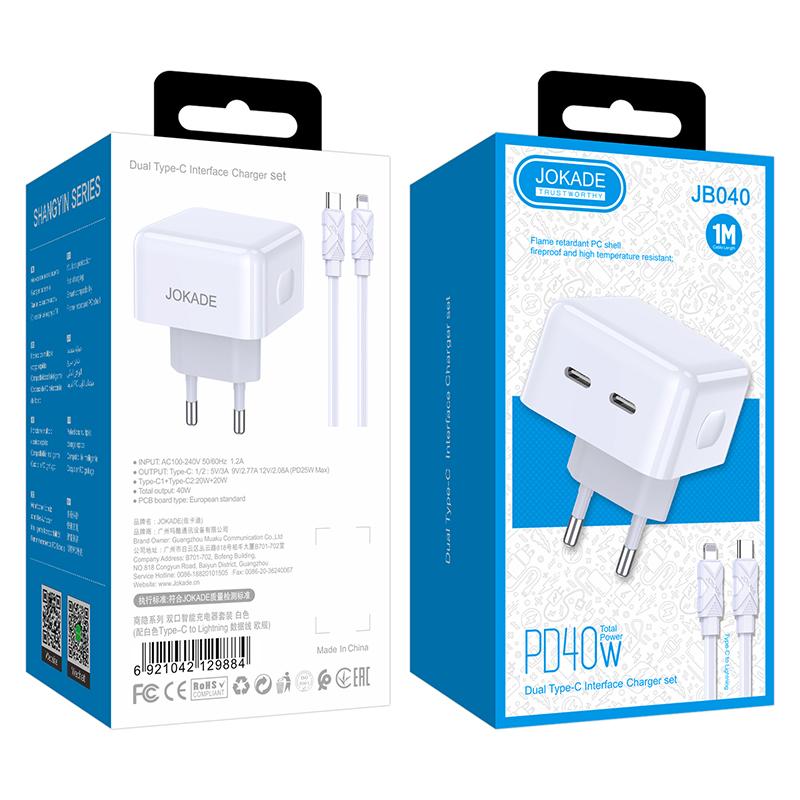 JB040 سلسلة SHANGYIN مجموعة شاحن ذكي PD40W بمنفذين قابس EU (تايب سي إلى آيفون) 4o